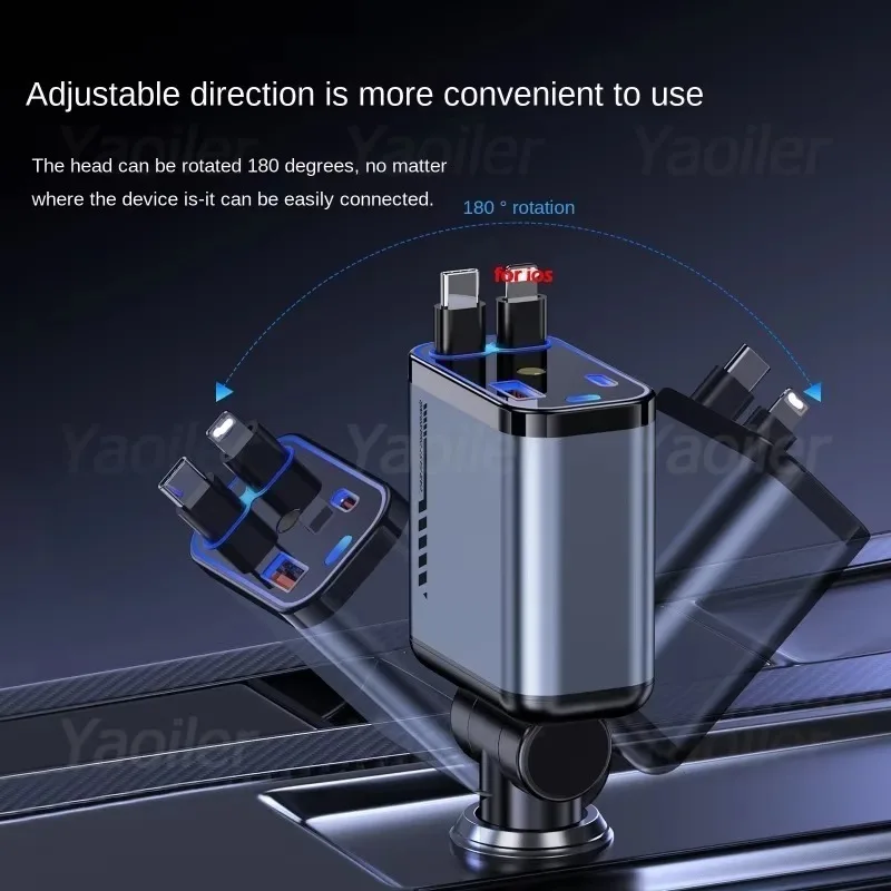 Das 4-in-1-Schnellladegerät fürs Auto mit zwei einziehbaren Kaben (Typ C und Lightning) und zwei zusätzlichen Anschlüssen (USB-C und USB-A), sodass das lästige Mitführen mehrerer Kabel und Ladegeräte entfällt. Dieser Kfz-Ladeadapter ermöglicht das schnelle Laden von bis zu vier Geräten gleichzeitig, wodurch mehrere Ladegeräte überflüssig werden und Ihr Auto übersichtlich bleibt.