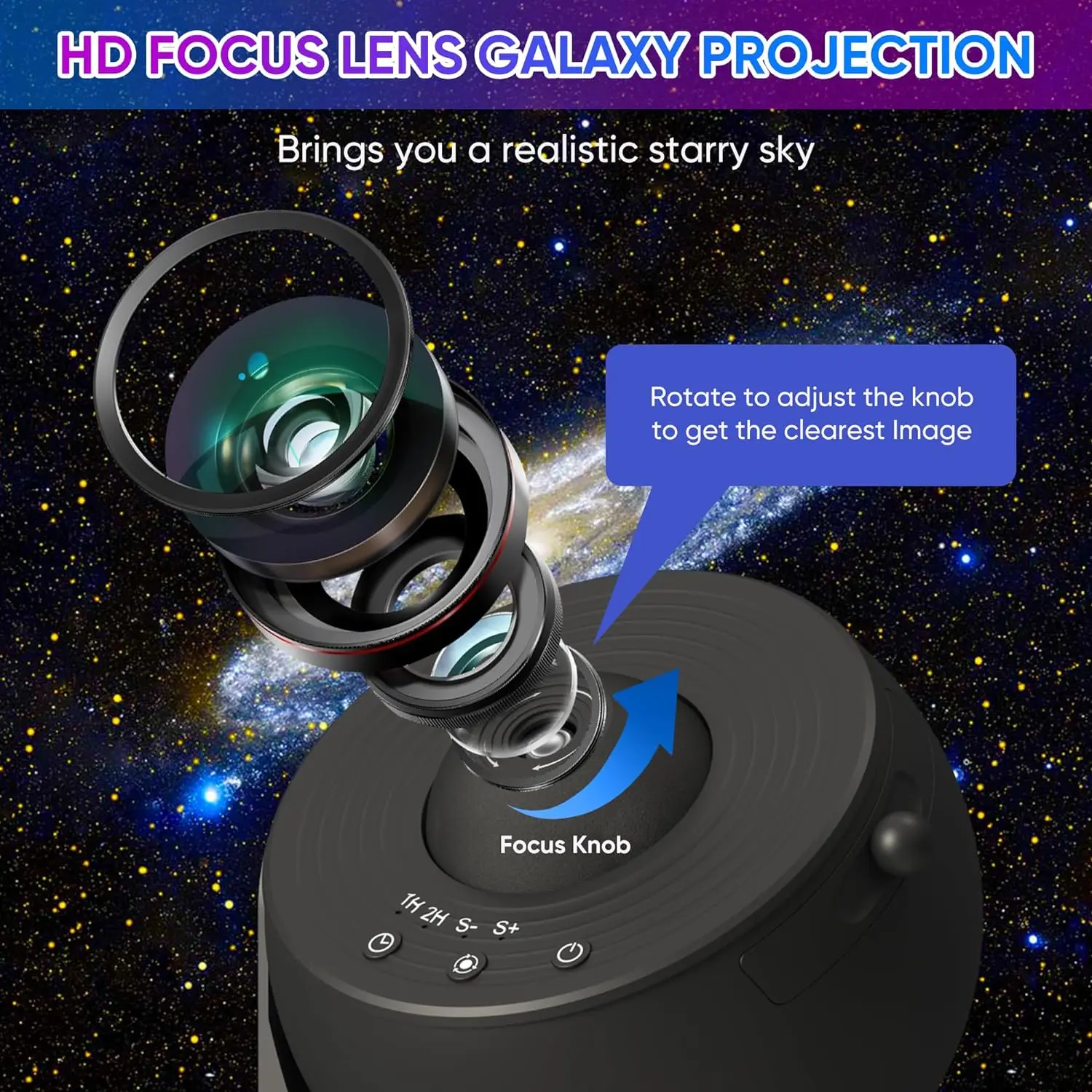 Der Galaxienlichtprojektor kann den Fokus durch Drehen des Fokussierkopfes feinabstimmen, um eine klare Abbildung